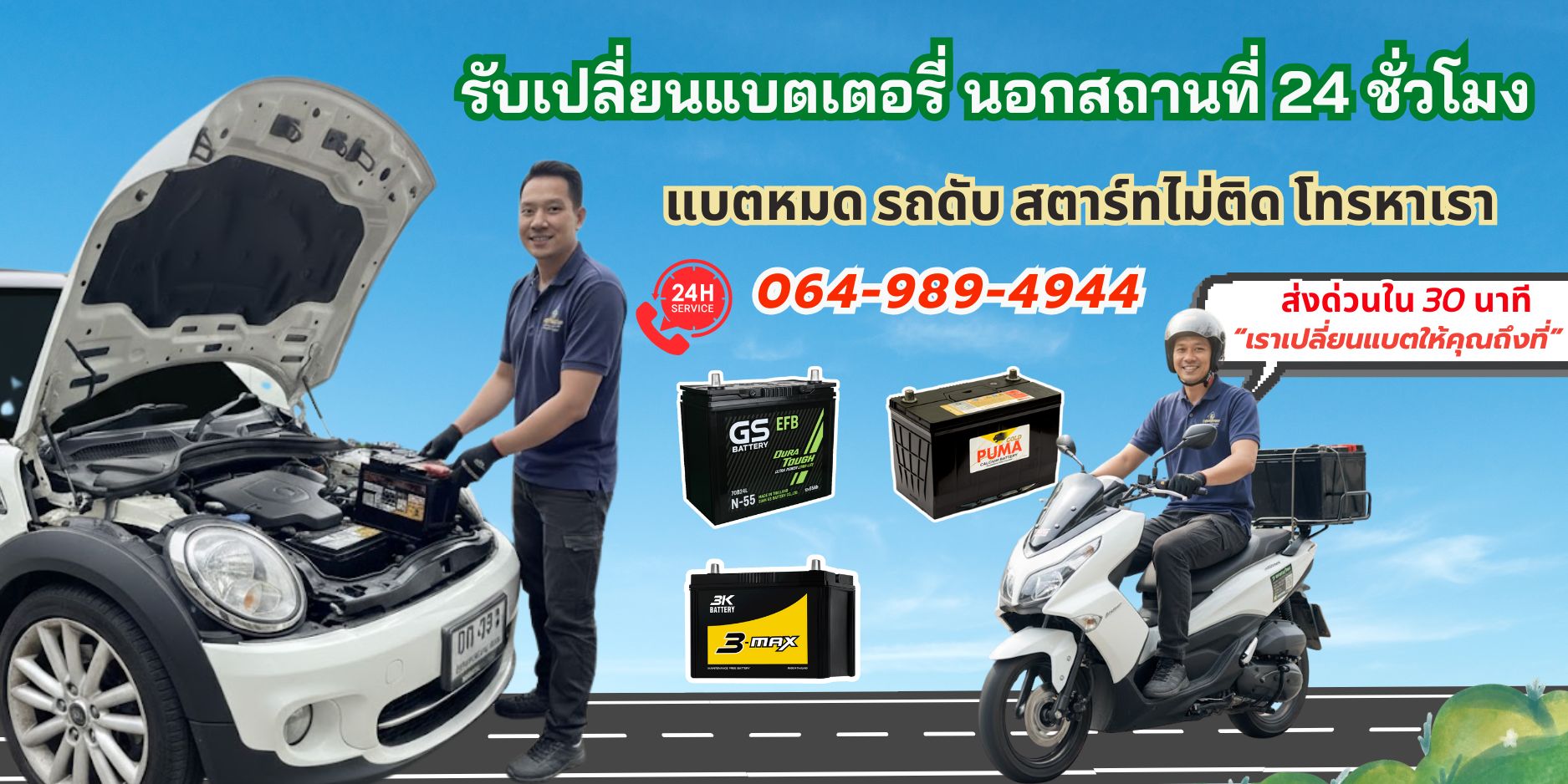 บริการเปลี่ยนแบตเตอรี่รถยนต์ - มอไซค์ นอกสถานที่ 24 ชั่วโมง พร้อมส่งถึงที่หมายใน 30 นาที เรามีแบตเตอรี่ตรงรุ่นทุกยี่ห้อ ราคาพิเศษ พร้อมให้คำแนะนำติดตั้งโดยช่างผู้เชี่ยวชาญประสบกาณ์ 12 ปี บริการติดตั้งฟรีในเขต กรุงเทพ ปริมณฑล